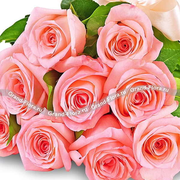 Роза розовая 50-60 см - 7 шт, упаковка, лента. На фото представлен букет из 9 роз.